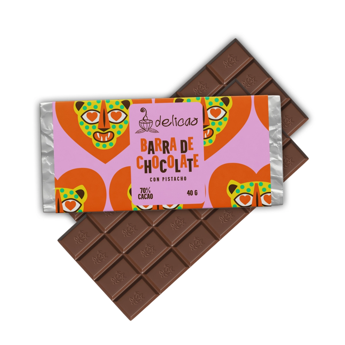 Delicio Chocolate presenta su barra gourmet de 40 gramos: una fusión exquisita entre chocolate oscuro al 70% y pistachos naturales, cuidadosamente seleccionados. Diseñada para los amantes del buen chocolate, esta barra ofrece un equilibrio perfecto entre la intensidad del cacao y la suave crocancia del pistacho, creando una experiencia sensorial única en cada porción.