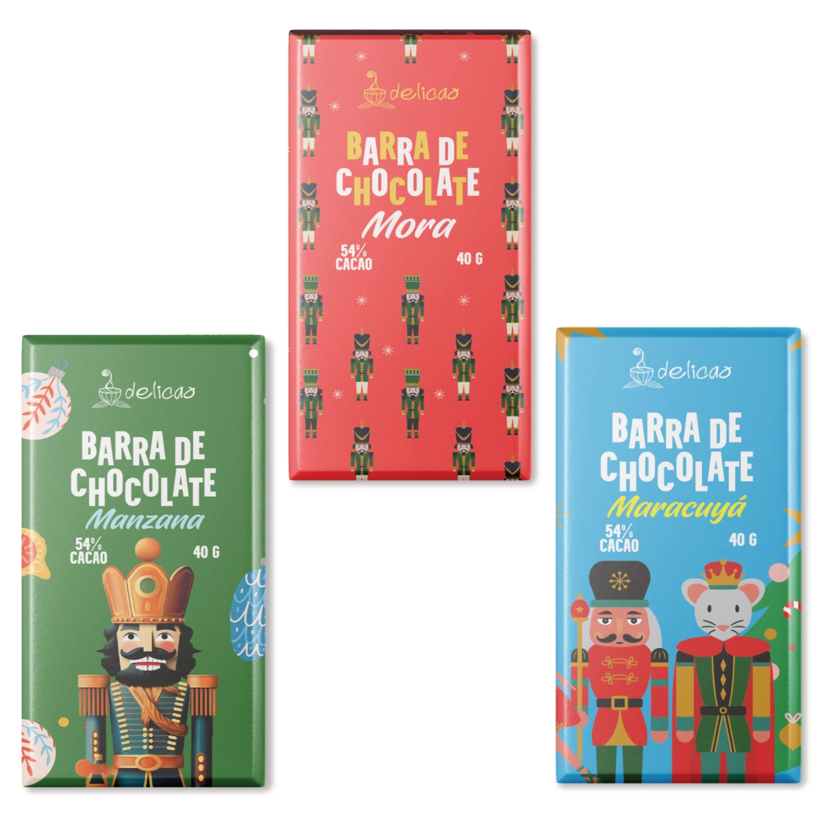 Celebra la magia de la temporada con nuestras barras de chocolate edición especial, elaboradas con chocolate Delicao 54% cacao y un toque único de fruta natural. Este pack reúne tres barras irresistibles, cada una con un perfil de sabor que evoca dulzura, frescura y espíritu festivo.