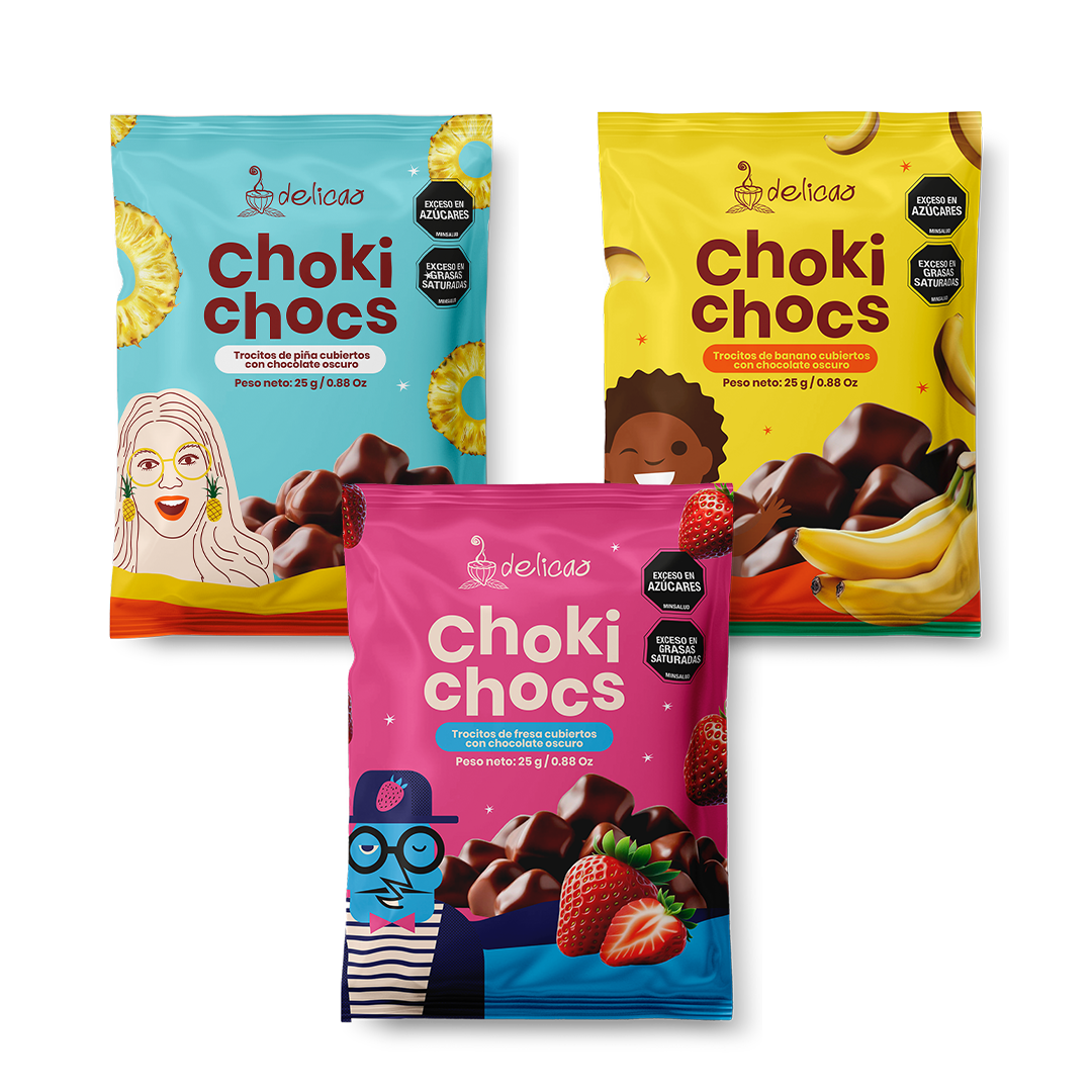 Choki Chocs mix es una experiencia tropical en tres tiempos: banano, fresa y piña crocantes, recubiertos con una capa de chocolate 54% cacao, que realza su sabor natural. Cada empaque de 25 g ofrece un contraste único entre el sabor frutal, la textura crujiente y el sentido intenso del chocolate. Elaborados de manera cuidadosa, sin conservantes ni aditivos, este snack es una elección saludable, deliciosa y práctica para llevar. Perfectos para quienes buscan variedad, autenticidad y un toque de dulzura natural con carácter. Tres sabores, una sola experiencia: real, vibrante y naturalmente irresistible.